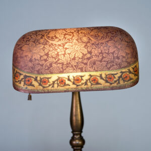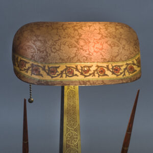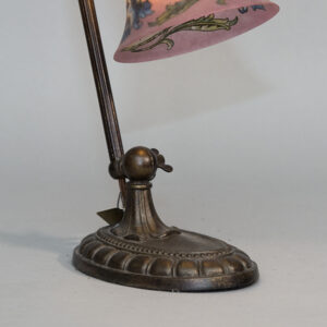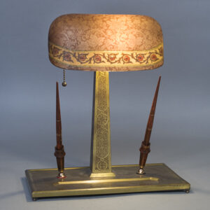 Bellova desk lamp with brown etched shade and red reverse painted floral border. Original 14 KT Eversharp fountain pens, and original base. Base is original finish. Lamp is perfect. Circa 1925.