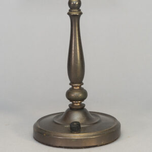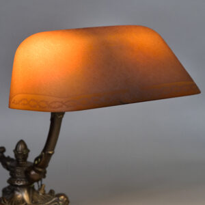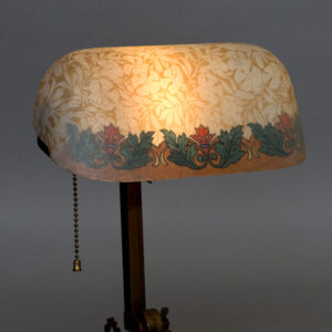 Very beautiful Boudoir lamp or desk lamp. Buff-colored, etched shade with reverse painted acanthus leaf green border. (No. 7)