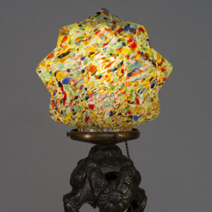 Attributed to Bellova. Acid etched with colorful floral design. Very unusual form. Mounted on an original Emeralite base with double knuckle adjustable base.