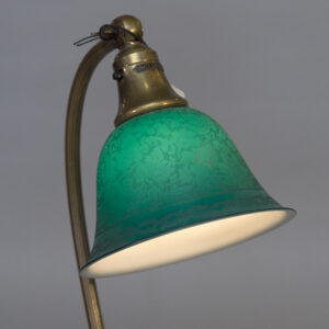 Bellova green acid etched lamp with bell-shaped shade. Mounted on a brass oval shaped base. Adjustable. Circa 1925.