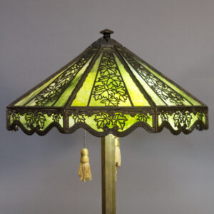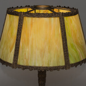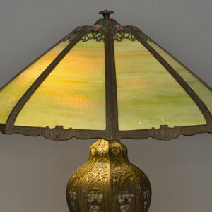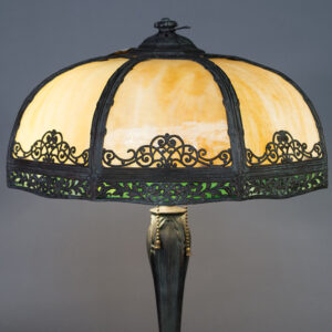 Very elegant 8-panel slag lamp with green border and and very delicate filigree. Beautiful patina with green highlights to shade and base. Great lamp. Circa 1930.