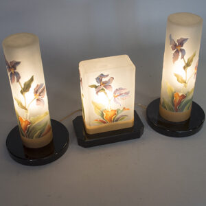 Very rare 3 piece Bellova ensemble. Cylinders are a matched pair, 3.5″ diameter 12″ tall. All cameo cut, with airbrush painted floral design. Center panel measures 8.5″ x 5.5″, also air brushed floral design. All three pieces are mounted on black glass bases. Excellent condition. Circa 1925.