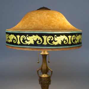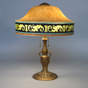 Very rare, large acid etched shade. Orange color with green and black border design. Mounted on original Bellova base. Great condition. Circa 1925.