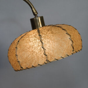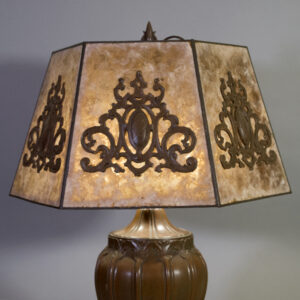 Mica table lamp with overlay on shade. Mounted on brown color original finish base. Circa 1920.