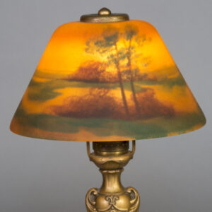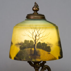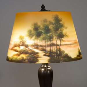 Jefferson Reverse painted landscape lamp. Satin-like finish to shade and very unusual form. Lamp base is signed on top ring.