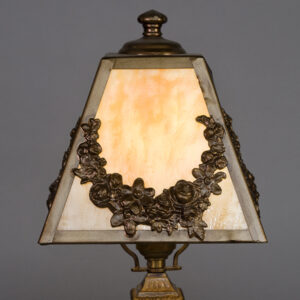 Very nice boudoir lamp with slag glass and overlay accent. All original. Circa 1920.