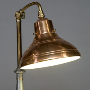 Mid century modern desk lamp. Copper shade with polished brass and steel shaft, mounted atop black onyx base trimmed in steel. Lamp has been polished and lacquered. Rewired. Circa 1940.
