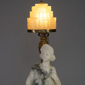 Marble and glass Newel post or table lamp. Very intricately carved marble woman figure, with a beautiful art deco glass shade. Circa 1920.